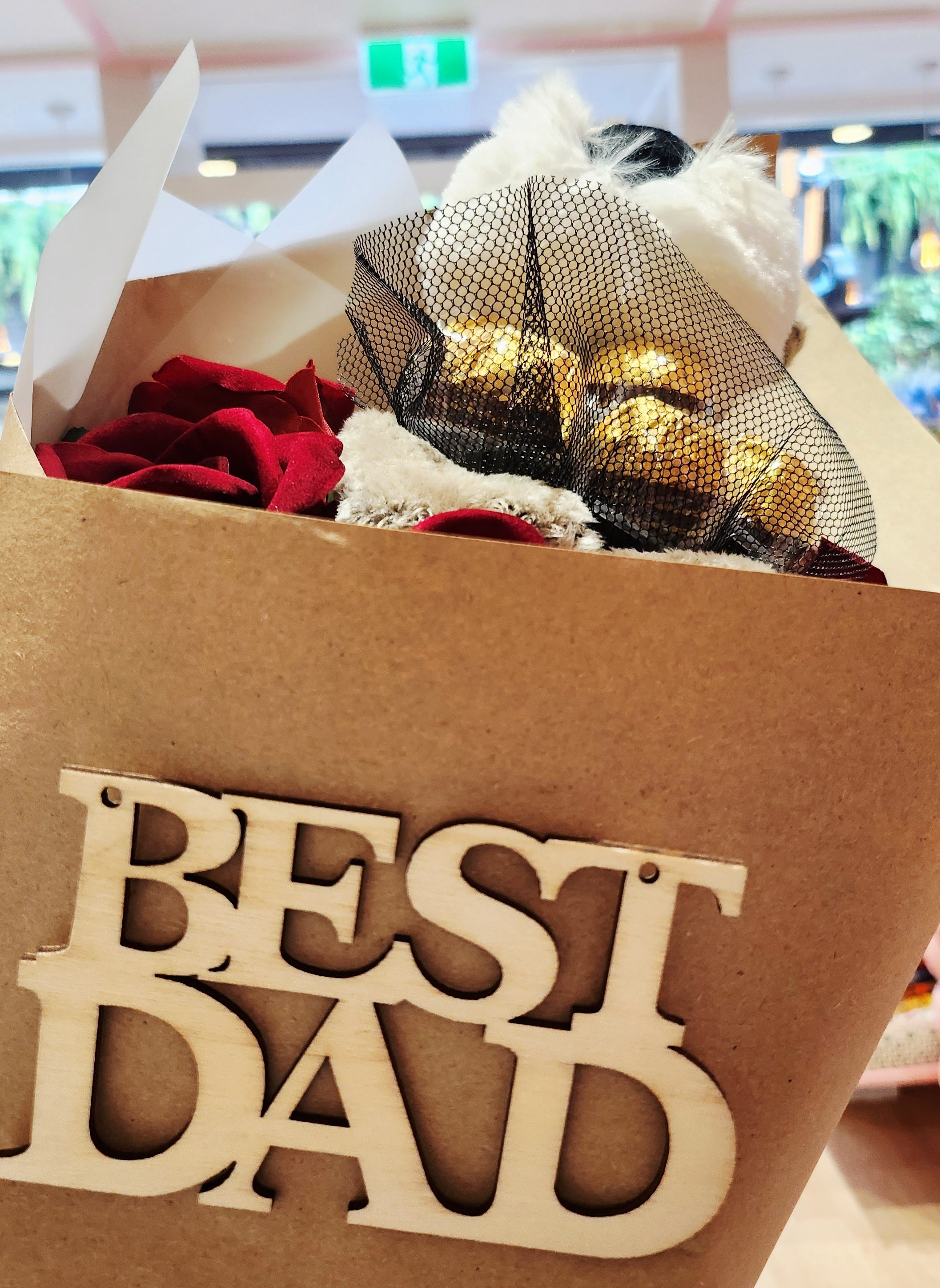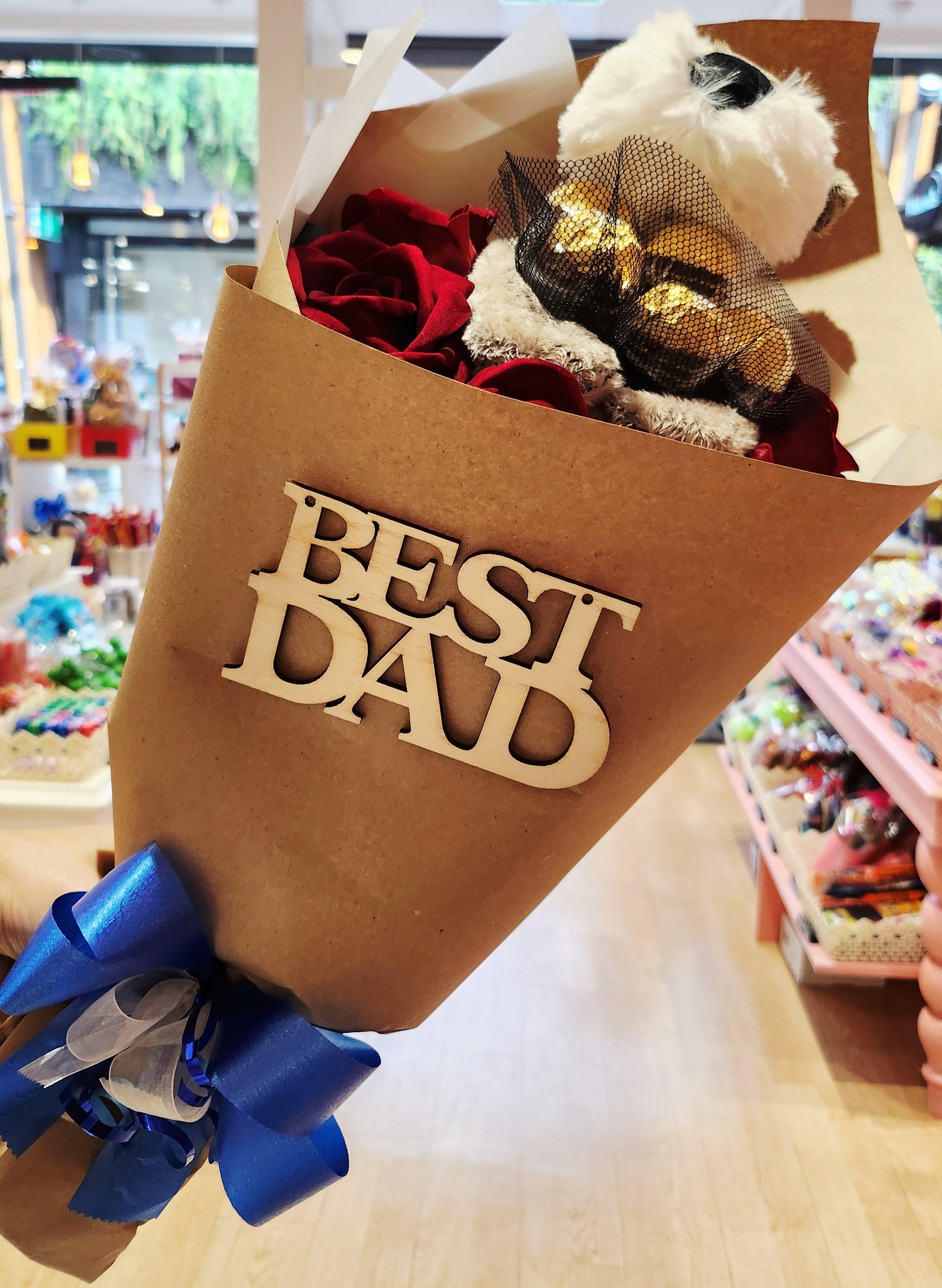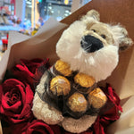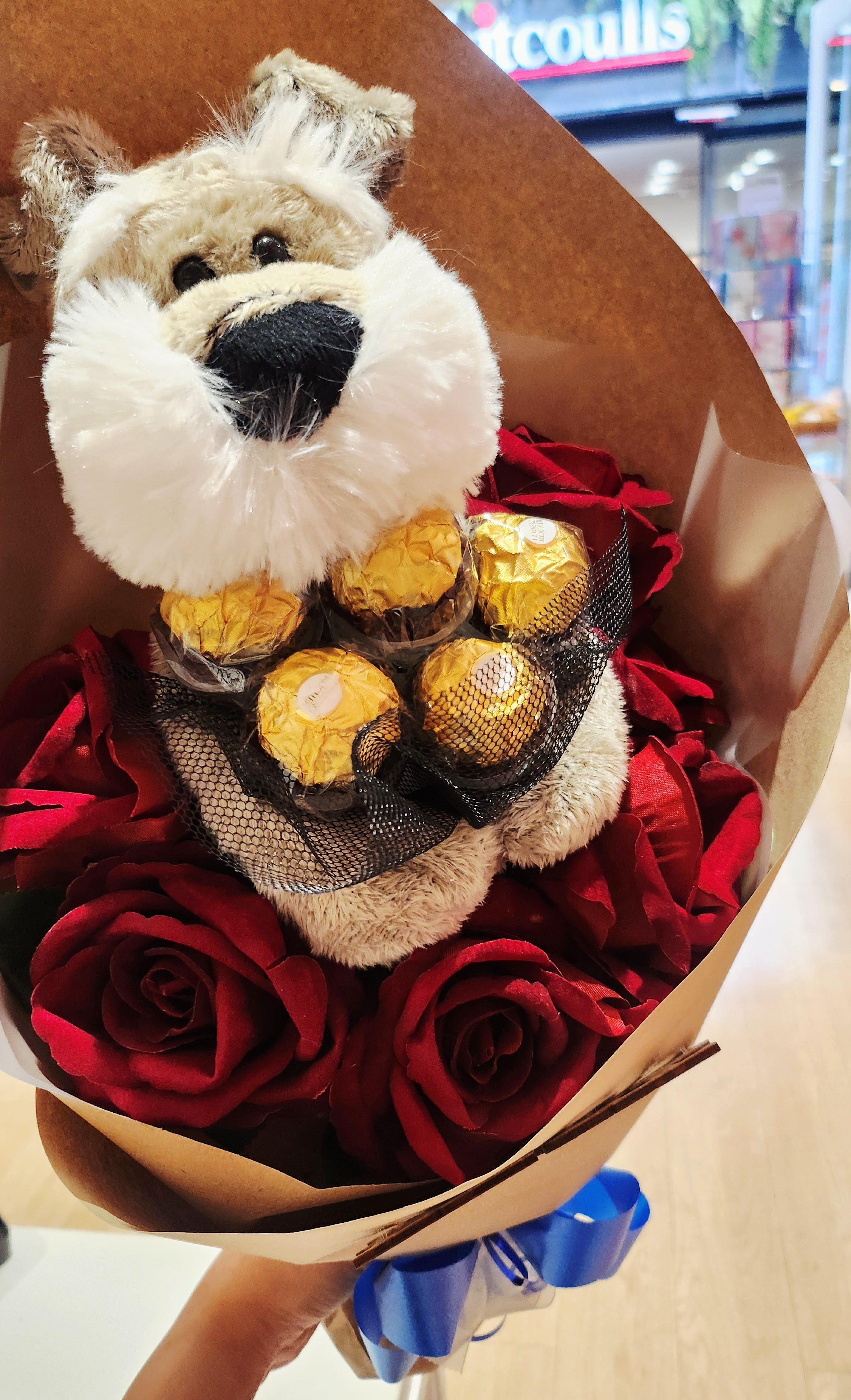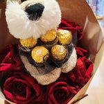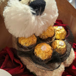 Description: Make Father’s Day extra special with this unique chocolate bouquet featuring a cuddly companion and a touch of elegance.