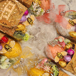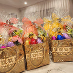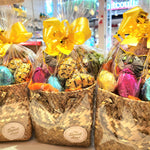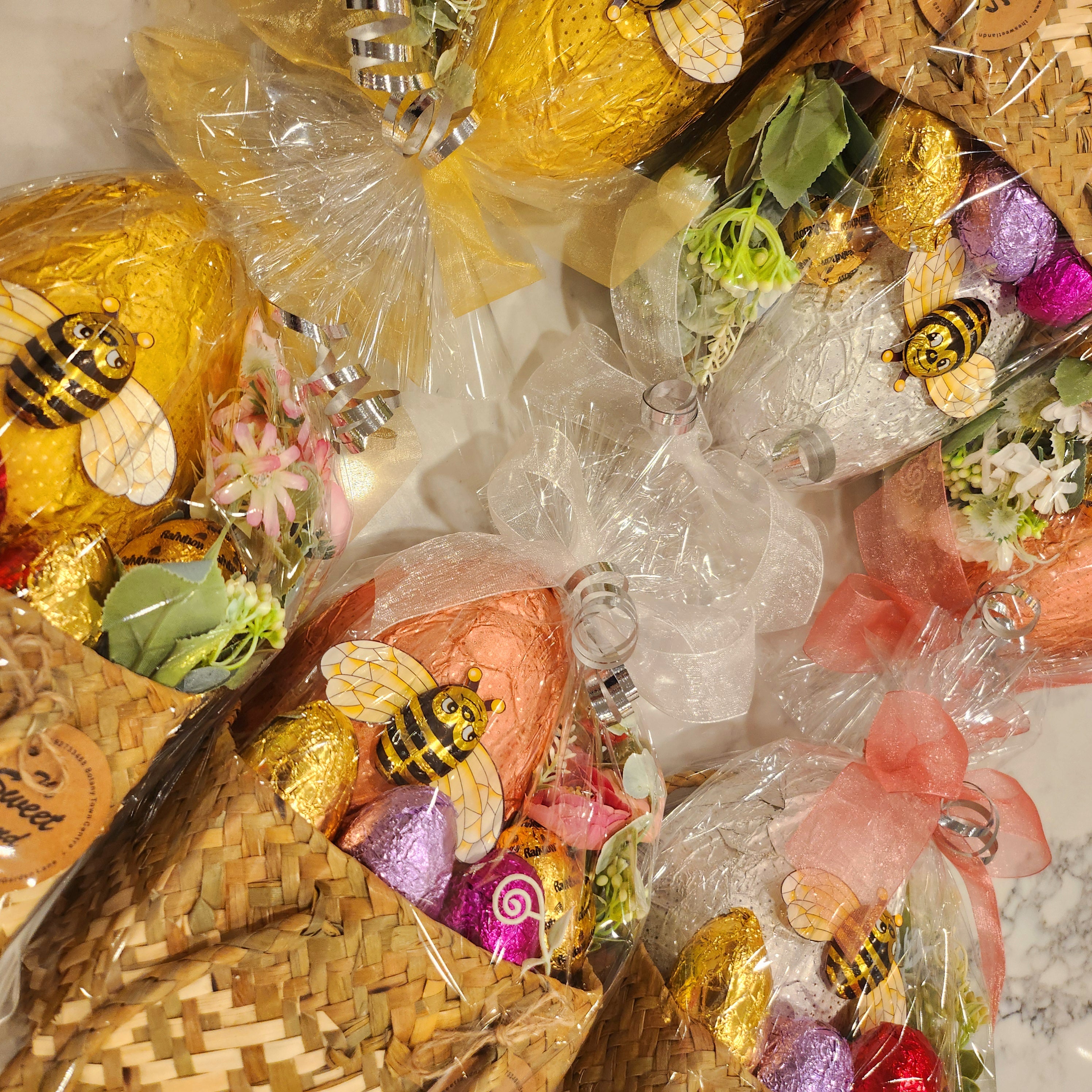 Description: Waikato Valley Chocolates Luxury Milk Chocolate Hollow Egg 100g x1, Rainbow Mashmellow eggs x2whole, x2halfan eggs, Waikato Valley Chocolates Easter Egg small eggs x3, Storz chocolate Animal x1, in Flax bag with artificial Flower decor
