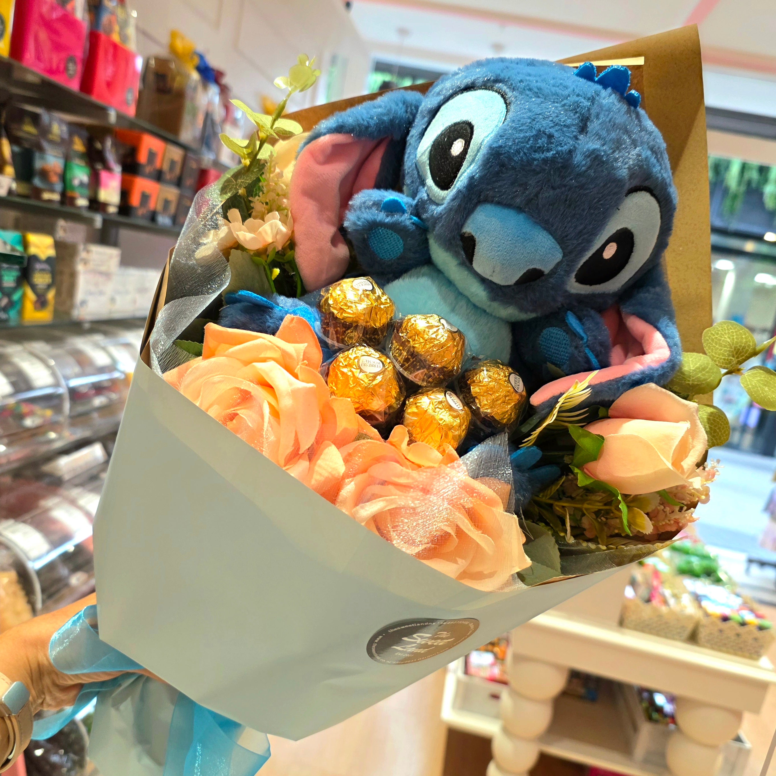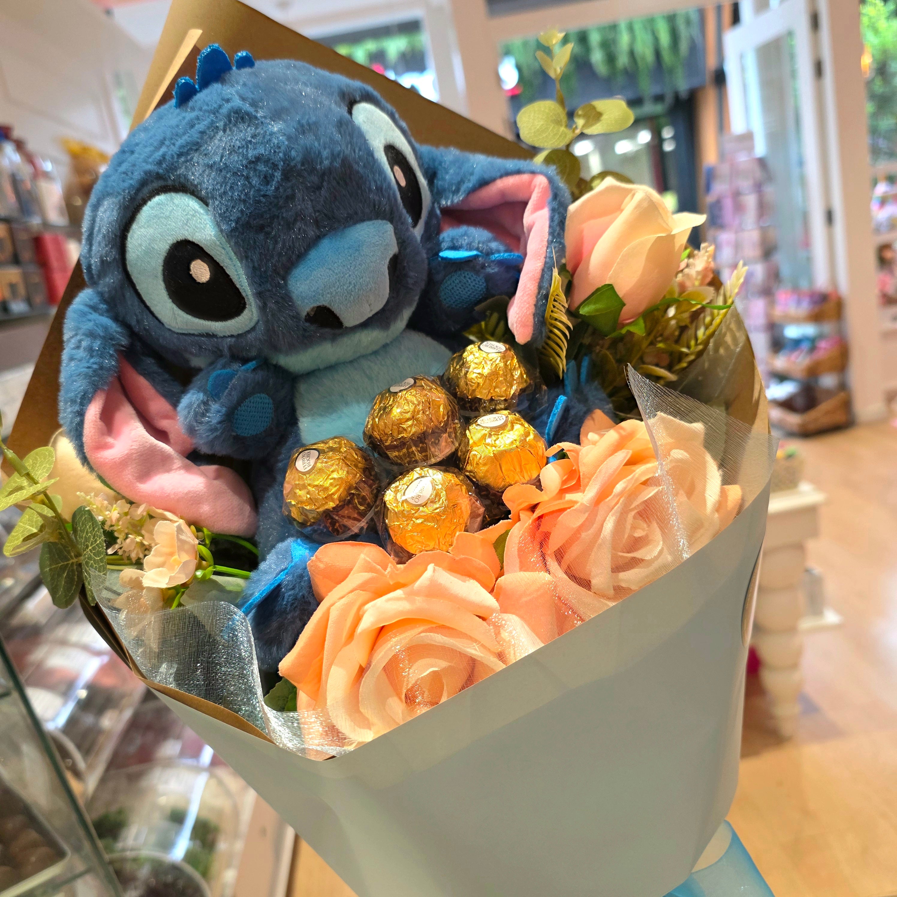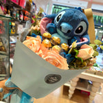 A sweet and adorable gift featuring the lovable character Stitch. This unique bouquet combines a cute plush Stitch with delicious chocolates and beautiful artificial flowers, carefully arranged for a fun and memorable surprise.