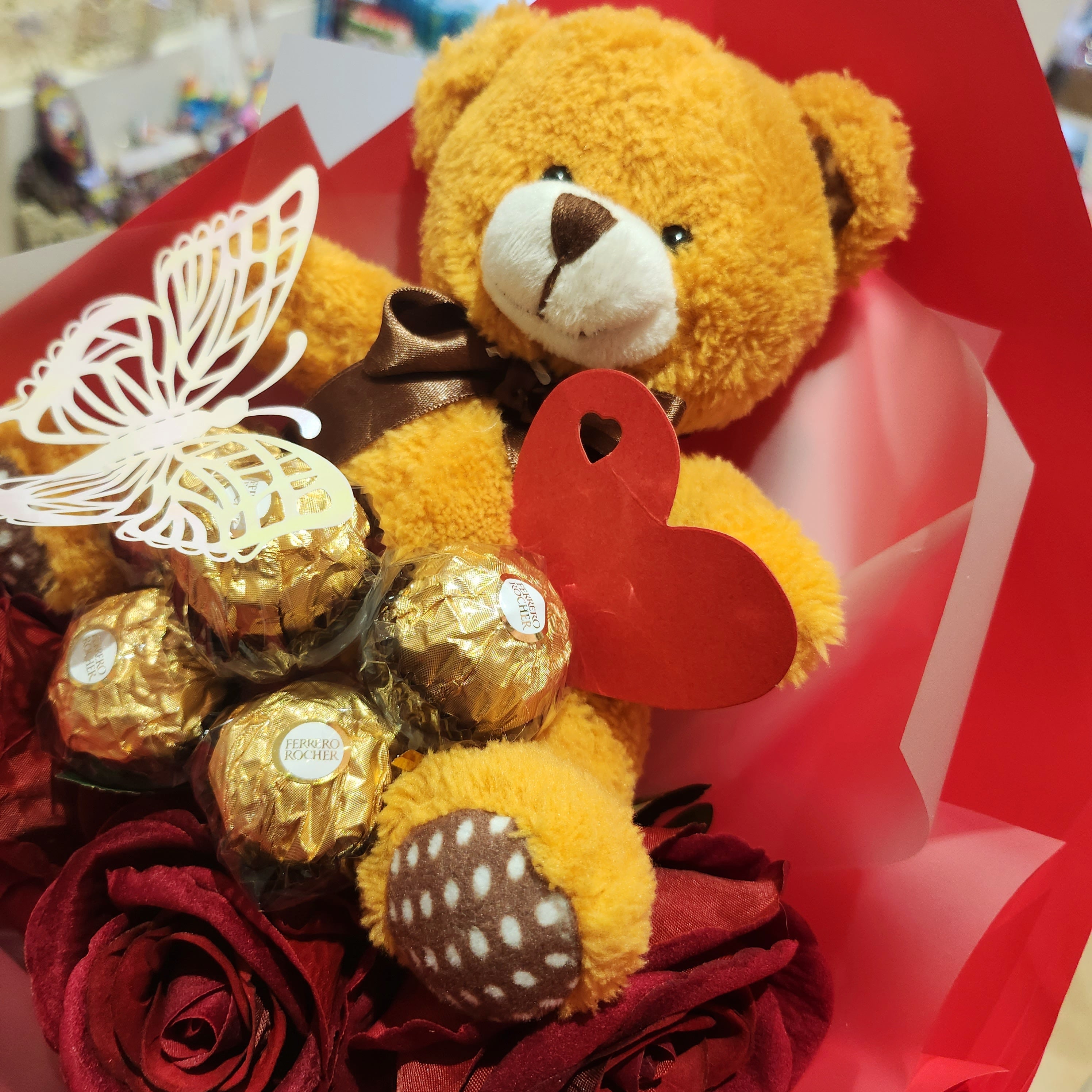 Description: Luxury High Quality Artificial Rose 3x with Ferrero Rocher 5x wrap with Red wrapping paper.