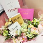Description : 6 Ferrero Rochers, 2 Bennetts Bars, 1 Bennetts Plum Crumble with Artificial Flower bunch in Pink Posie Box