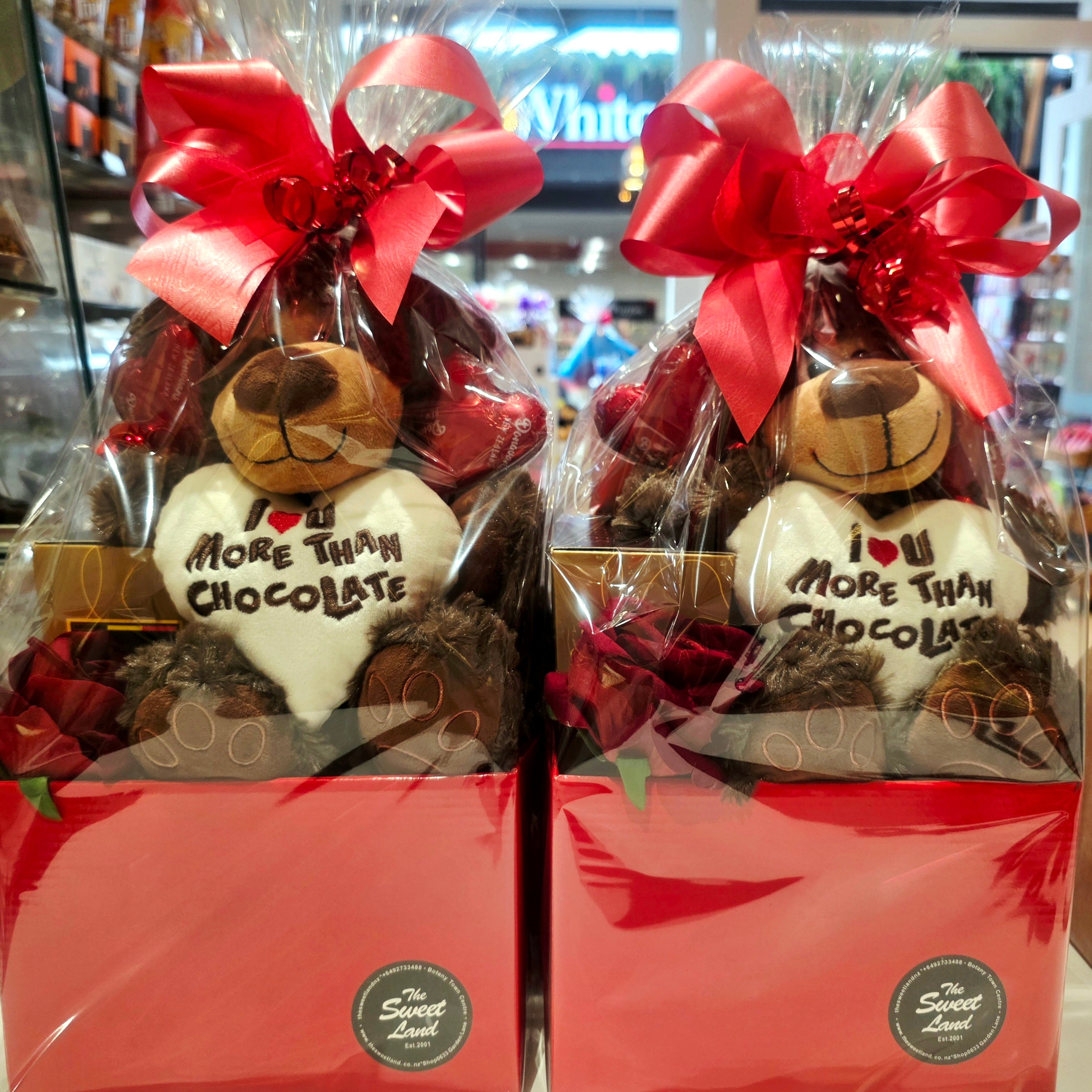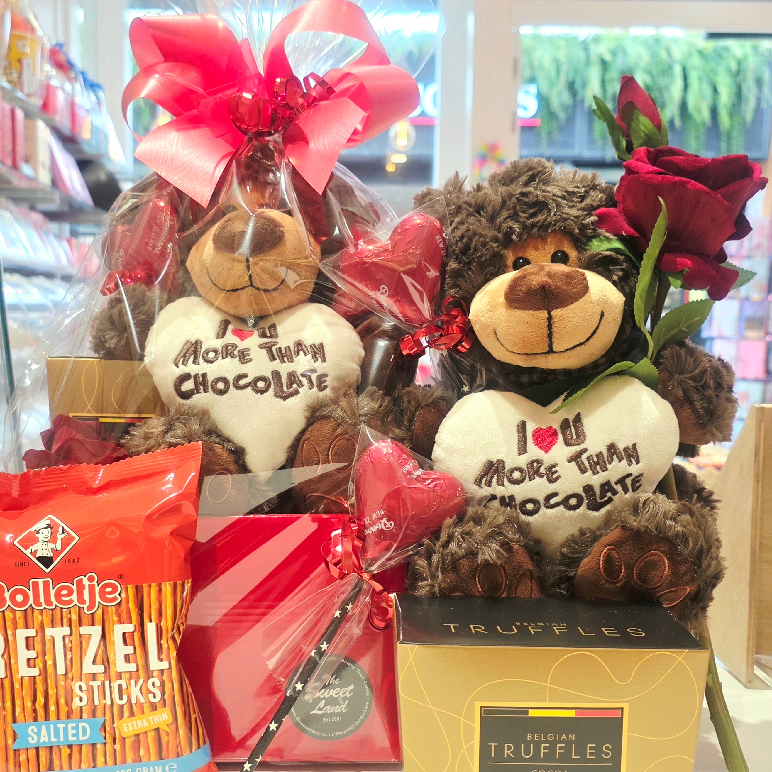 This beautifully presented Valentine’s basket includes a cuddly teddy holding a “More Than Chocolate” heart, indulgent chocolates, and a romantic red rose — all wrapped and ready to gift.