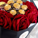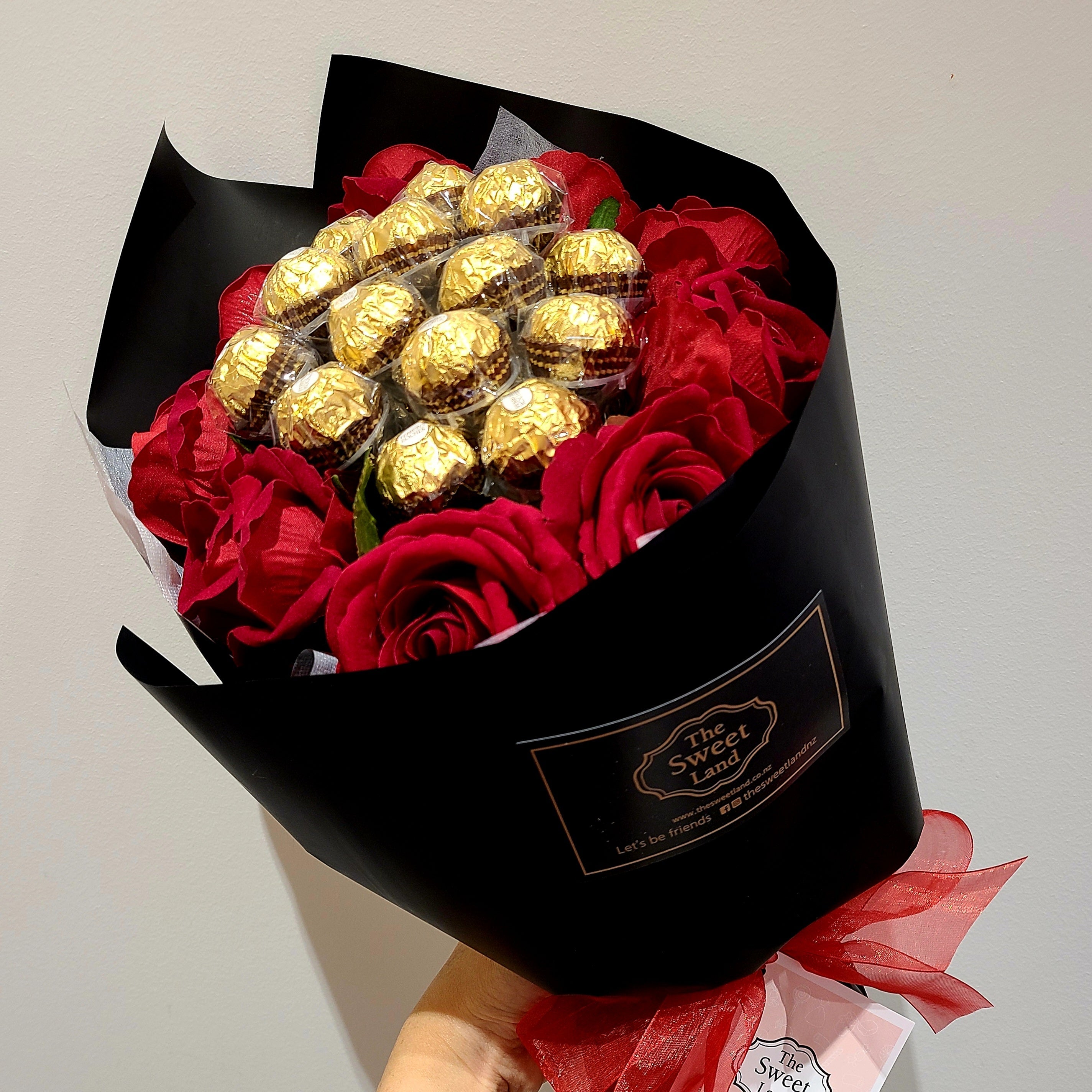 Description: Luxury High Quality Artificial Rose 9x with Ferrero Rocher 14x wrap with Black wrapping paper. Red Bow.
