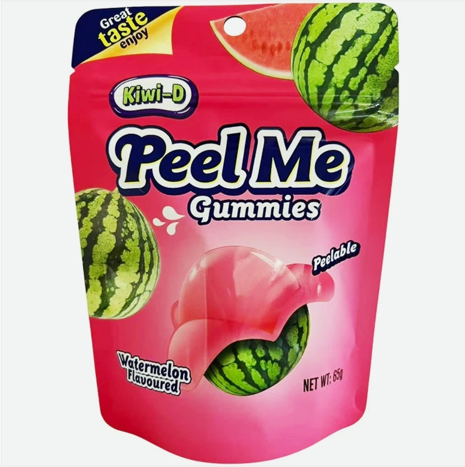 Description: These trendy gummies are made to peel! Peel Me Gummies (65g) feature fruit-inspired layers and chewy insides in mango, banana, peach, grape, and watermelon flavours. Are you ready to peel these trendy treats?